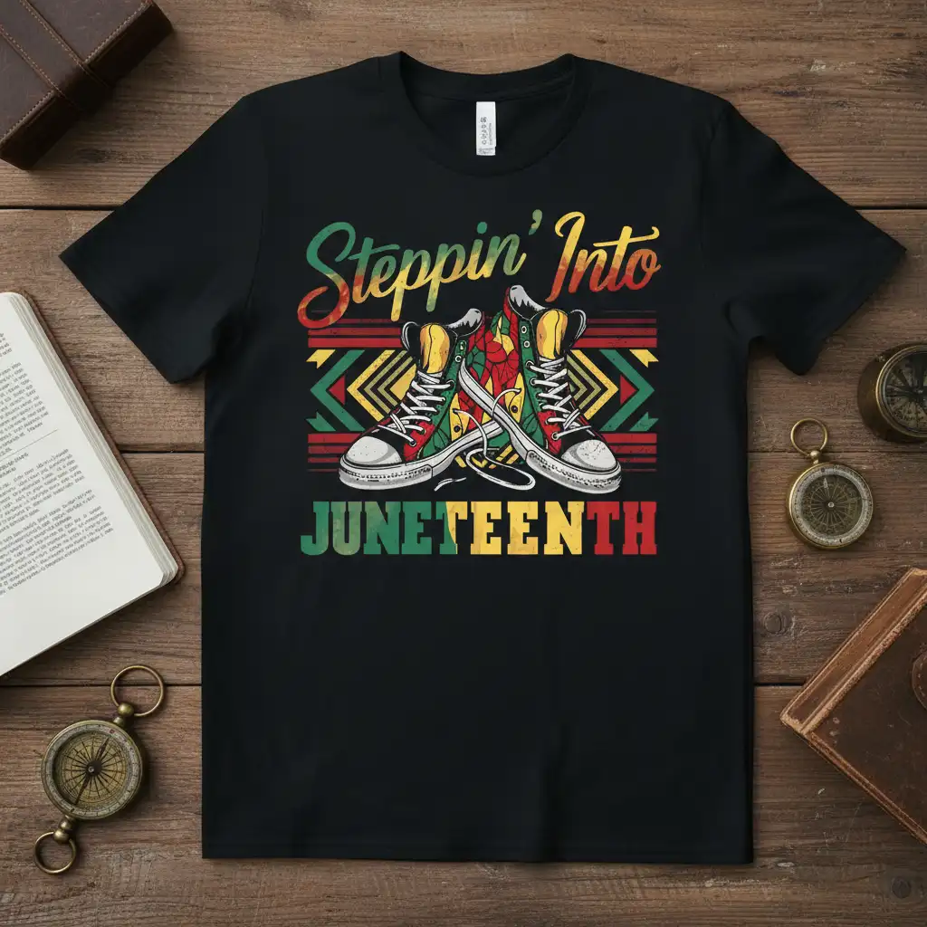 The graphic elements are carefully curated to represent the spirit of Juneteenth – a day of celebration, reflection, and remembrance. The combination of the sneakers and the symbolic patterns creates a visually engaging piece that resonates with the cultural significance of the holiday. This Steppin’ Into Juneteenth design is a versatile addition to your wardrobe, suitable for both casual and festive occasions.