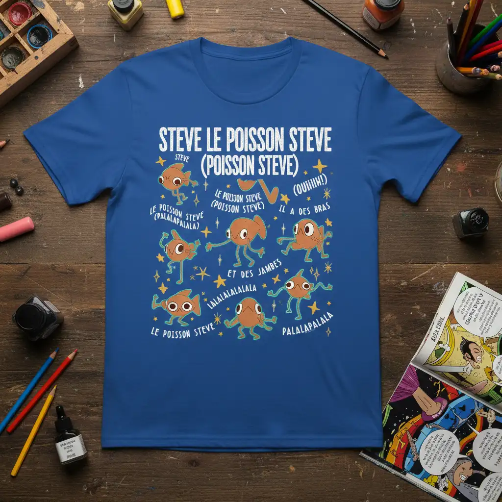 STEVE LE POISSON STEVE STEVE (POISSON STEVE) LE POISSON STEVE (PALALALALALA) LE POISSON STEVE (POISSON STEVE) (OUIIIIH!) IL A DES BRAS ET DES JAMBES LALALALALALALALA PALALAPALALA LE POISSON STEVE PALALAPALALA is more than just a phrase; it’s a vibrant explosion of French animation humor that captures the quirky spirit of a beloved character. This design brings to life the energetic and playful world of Steve, the fish who knows how to have a good time. It’s perfect for those who appreciate unique, character-driven art and want to wear their love for animated fun. The combination of whimsical characters and nonsensical, catchy phrases makes this tee a standout piece.