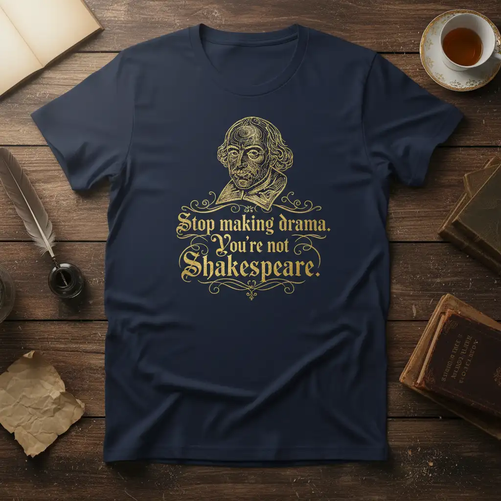 This shirt is perfect for anyone who loves to make a statement or has a penchant for theatrical flair. The “Stop making drama. You’re not Shakespeare.” quote is a witty way to communicate your feelings without saying a word. It’s a bold and humorous piece that adds personality to any outfit, making it a go-to item for those who aren’t afraid to stand out. Let your clothing reflect your vibrant personality.