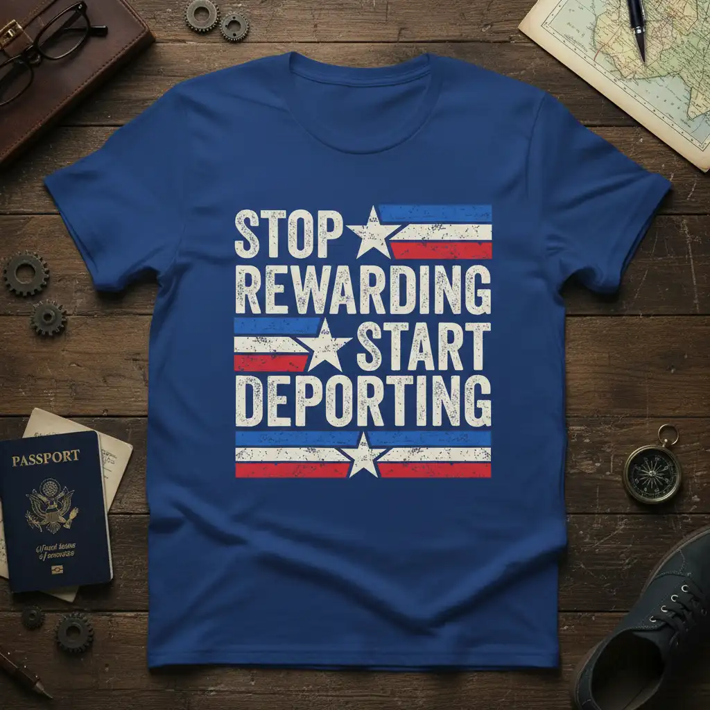 Stop Rewarding Start Deporting this t-shirt is designed for individuals who wish to express a strong and clear political stance. It features bold, distressed lettering that makes a statement about immigration policy and national priorities. This apparel is perfect for those who believe in taking a firm approach to border control and national sovereignty. The design is meant to spark conversation and convey a particular viewpoint on current events and governance. Wear your convictions proudly and let your voice be heard with this impactful graphic tee.