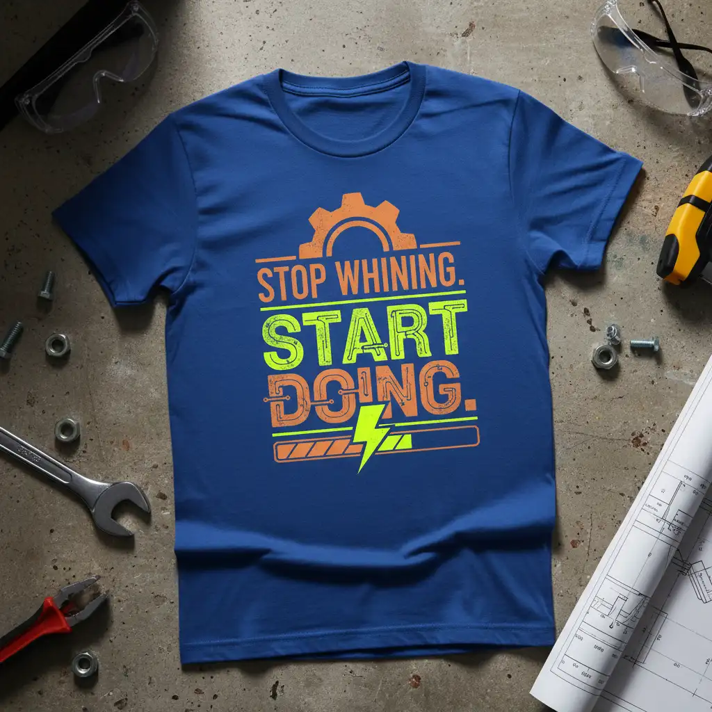 This striking design features the empowering message “STOP WHINING. START DOING.” emblazoned across the chest in a dynamic, eye-catching font. The vibrant orange and neon green colors pop against the deep blue fabric, creating a look that is both energetic and stylish. Accompanying the text are powerful graphics, including a bold gear that signifies hard work and a lightning bolt that represents quick, effective action. This combination creates a compelling visual that resonates with anyone dedicated to productivity and achievement.