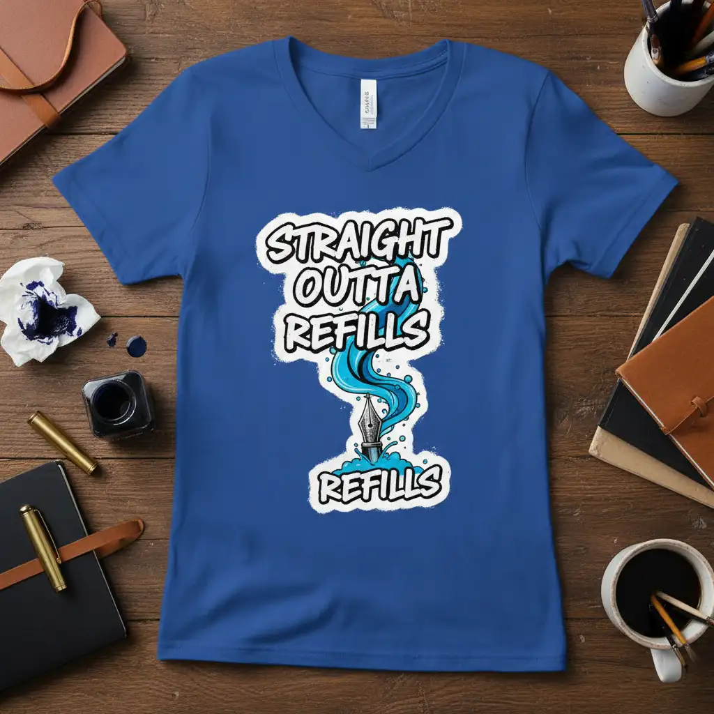 The graphic features a dynamic fountain pen illustration with a vibrant splash of blue ink, visually representing the essence of ink-based creativity. It captures the energy and excitement associated with writing and the constant pursuit of that perfect refill. The bold typography ensures the message is clear and impactful, making it a standout piece in any wardrobe.
