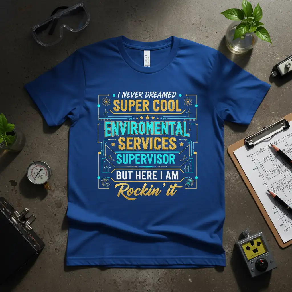 This t-shirt is more than just clothing; it’s a declaration of pride and a celebration of professional identity. The “I NEVER DREAMED SUPER COOL ENVIROMENTAL SERVICES SUPERVISOR BUT HERE I AM Rockin’ it” slogan is a testament to ambition, perseverance, and success. It’s a perfect way to stand out and show the world how much you love what you do.
