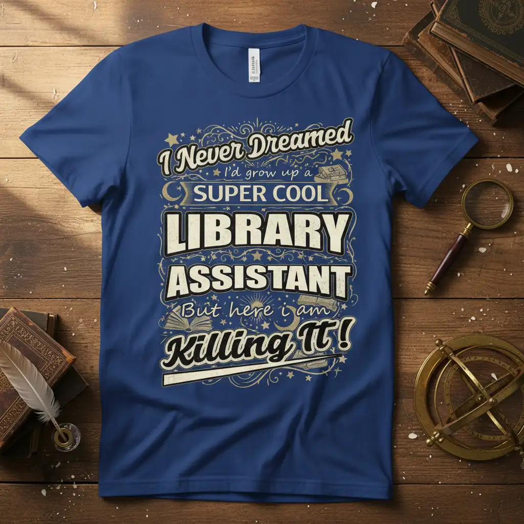 I Never Dreamed I’d grow up a SUPER COOL LIBRARY ASSISTANT But here i am Killing It! This t-shirt is the ultimate declaration for those who love their job and excel at it. Designed for library professionals, this shirt blends humor with pride, celebrating the often-underestimated role of a library assistant. It’s perfect for anyone who has a passion for books, organization, and helping others discover new worlds within the pages. Make a statement and show off your dedication with this unique and comfortable tee.