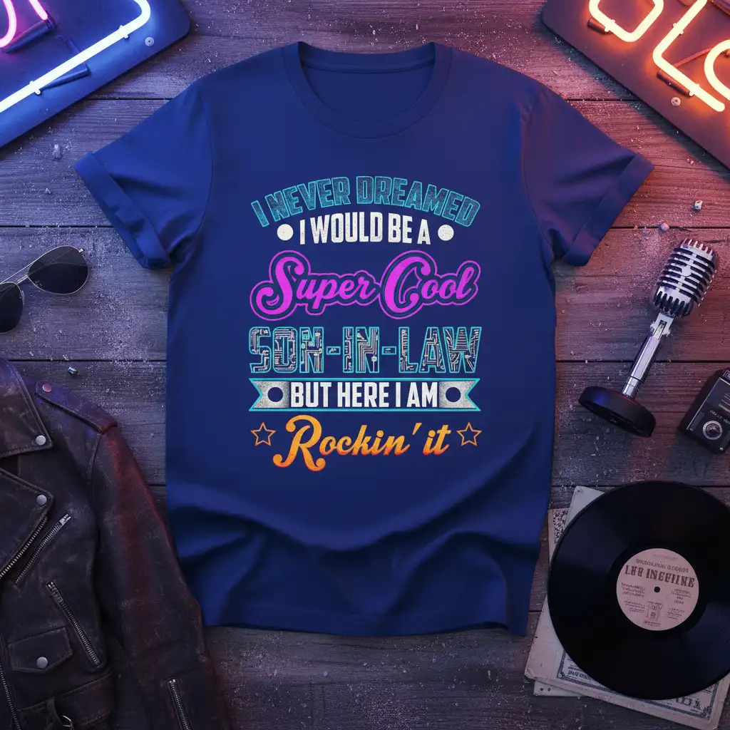 I NEVER DREAMED I WOULD BE A Super Cool SON-IN-LAW BUT HERE I AM Rockin’ it is more than just a phrase; it’s a declaration of appreciation and a celebration of family bonds. This unique t-shirt captures the sentiment perfectly, making it an ideal gift for that special son-in-law who brings joy and coolness into your life. Its eye-catching design and comfortable fit ensure it will quickly become a favorite piece in his wardrobe. This shirt is designed to be a conversation starter and a source of smiles for years to come.