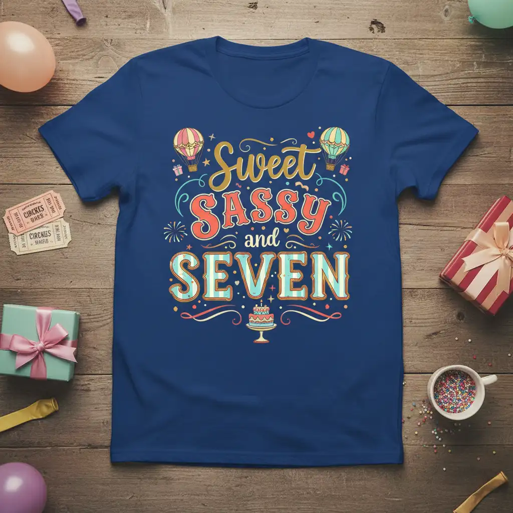 The combination of “Sweet” and “Sassy” in the design speaks to the multifaceted personality of seven-year-old girls. It’s a fun, empowering message that celebrates their individuality. This shirt is designed to be a conversation starter, bringing joy to everyone who sees it and making the birthday girl feel extra special.