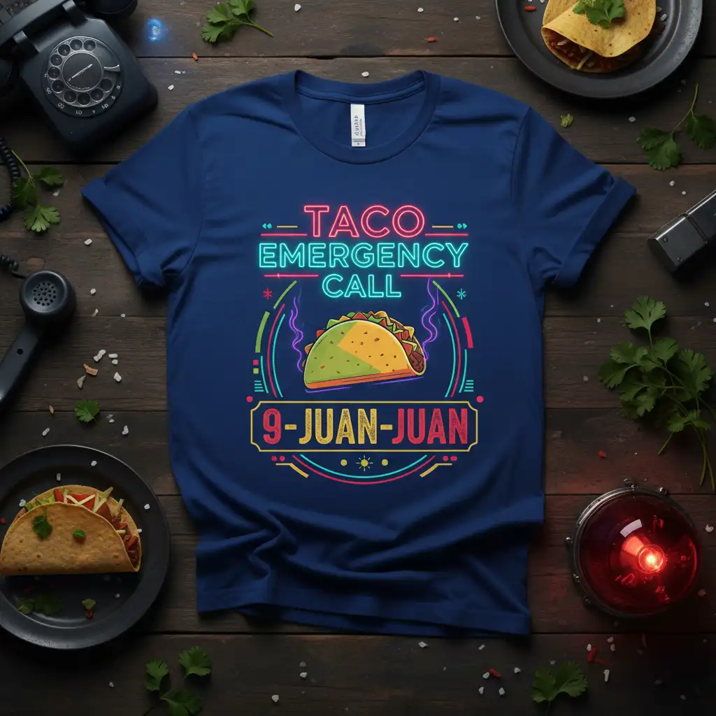 TACO EMERGENCY CALL 9-JUAN-JUAN is more than just a phrase; it’s a declaration of love for everyone’s favorite Mexican dish. This vibrant t-shirt captures the urgent need and undeniable joy that a taco brings into our lives. It’s designed for those who understand that sometimes, a taco craving is a true emergency that needs immediate attention. Whether you’re heading to a fiesta, enjoying Taco Tuesday, or just satisfying a midday craving, this shirt makes a bold statement about your culinary priorities.