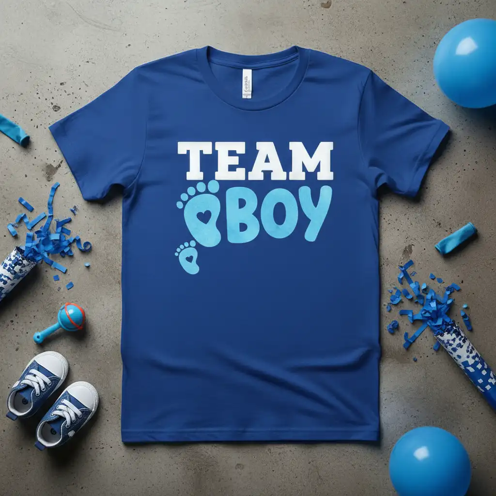 Choose your ideal color to match your personal style or the party theme: Black, Red, Navy, White, Dark Heather, or Royal. Each color option provides a distinct look while keeping the “Team Boy” message front and center. These classic colors ensure the design pops, making it a versatile addition to any wardrobe. Coordinate your look with the perfect hue for your celebration.
