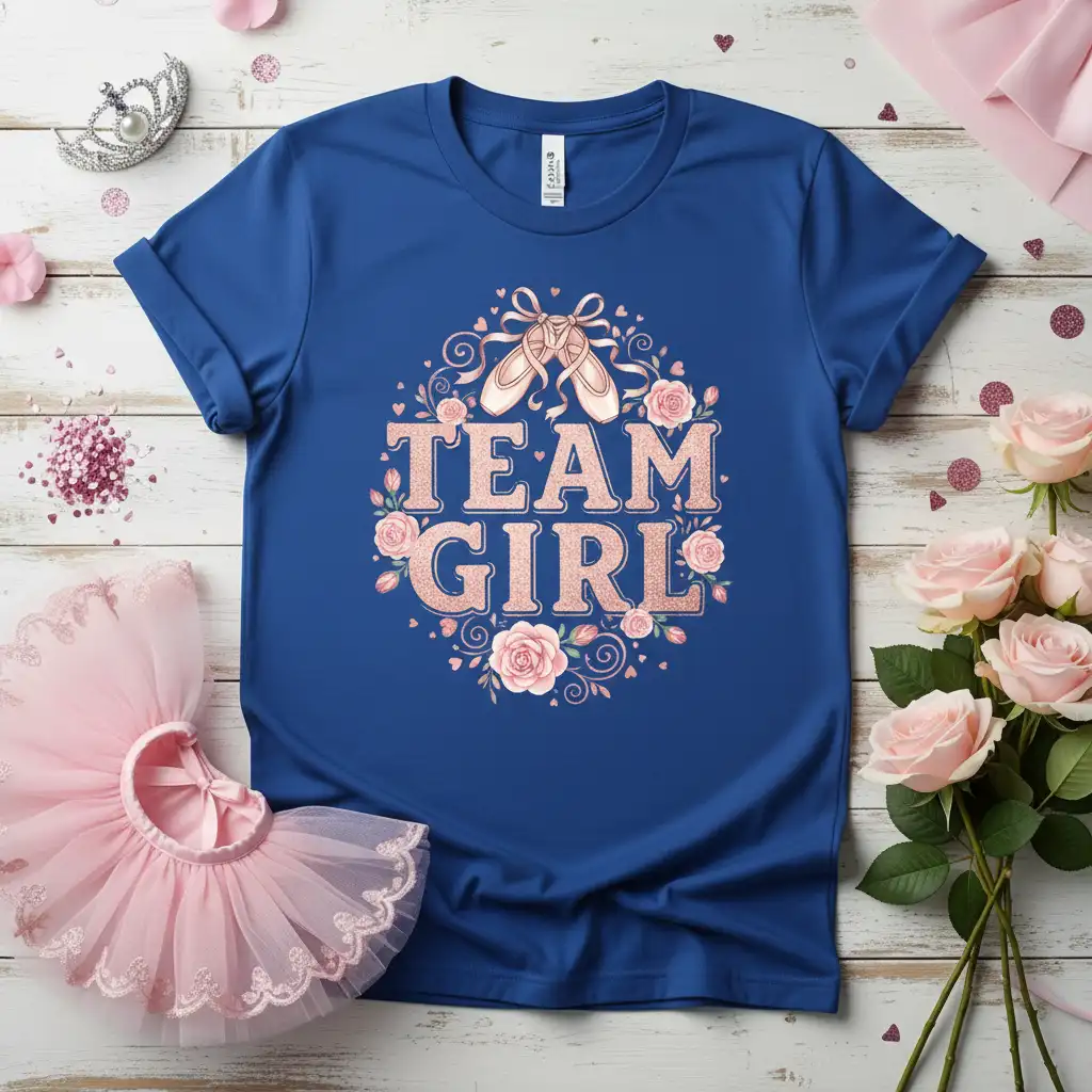 This “Team Girl” shirt is designed for those who dream of tiny toes and graceful pirouettes. It’s a tribute to the beauty and elegance of ballet, perfectly suited for announcing the arrival of a daughter. The intricate details, from the shimmering text to the delicate rose and ribbon accents, create a look that is both sophisticated and heartwarming.