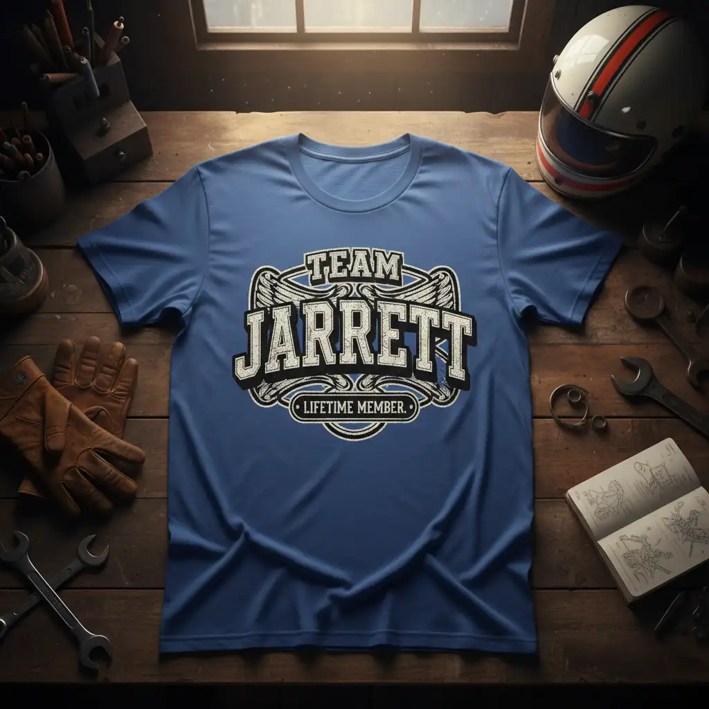 This exclusive t-shirt design is crafted for the dedicated members of the Jarrett family. It features bold typography that clearly states “TEAM JARRETT LIFETIME MEMBER,” symbolizing an unbreakable bond and a lifelong commitment to family. The accompanying graphic elements, like the stylized wings, add a touch of classic appeal and emphasize the esteemed status of being a lifetime member. It’s a powerful way to express your identity and connect with fellow family members.