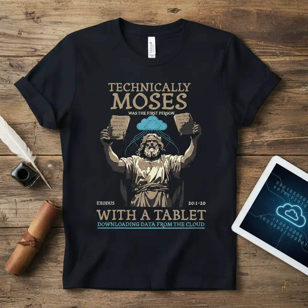 This “Technically Moses Was The First Person with a Tablet Downloading Data from the Cloud” t-shirt is more than just clothing; it’s a way to express your unique perspective. It’s a conversation starter, a source of amusement, and a stylish addition to any casual outfit. Don’t miss out on the chance to own this witty piece that perfectly blends biblical lore with the digital age. Order yours today and wear your sense of humor with pride!