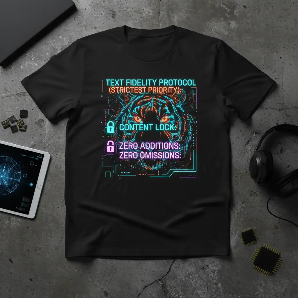 This statement tee is crafted for the discerning tech enthusiast who appreciates the nuances of digital security and data management. The bold text, “Text Fidelity Protocol (Strictest Priority): Content Lock: Zero Additions: Zero Omissions,” serves as a powerful reminder of the importance of maintaining absolute accuracy and completeness in all digital content. The vibrant neon artwork, featuring a stylized tiger and intricate digital patterns, makes this shirt a standout piece for any wardrobe. It’s designed to spark conversations and connect like-minded individuals who value technical excellence and robust security measures.
