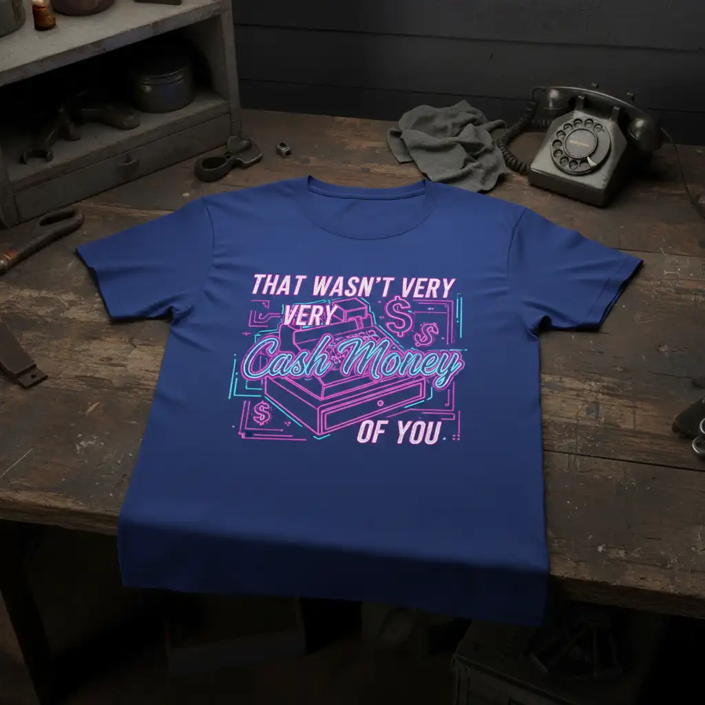 THAT WASN’T VERY VERY Cash Money OF YOU. This statement tee is designed for those who love to express their personality with a touch of humor and a dash of sarcasm. It’s more than just a shirt; it’s a conversation starter and a declaration of your unique sense of style. The eye-catching design features a retro cash register graphic, complete with neon-like accents and dollar signs, all framed by a bold, witty quote. This piece is perfect for anyone who appreciates clever wordplay and enjoys making a memorable impression wherever they go. Wear it out and watch the smiles and nods of recognition come your way.