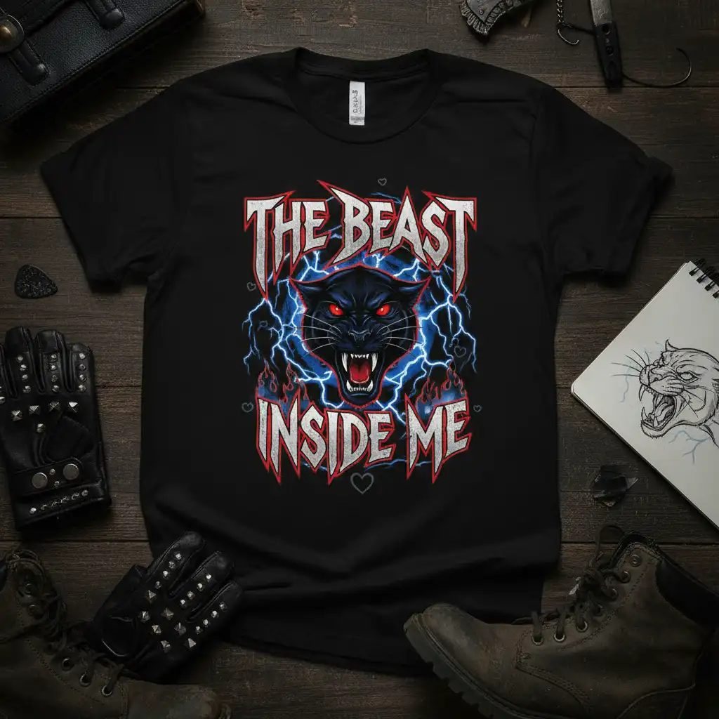 This captivating graphic tee features the powerful phrase “THE BEAST INSIDE ME” in striking, distressed typography that commands attention. The central image of a black panther with piercing red eyes embodies ferocity and untamed power. Lightning bolts surge around the panther, symbolizing raw energy and intensity, while flames add a touch of primal heat to the design.