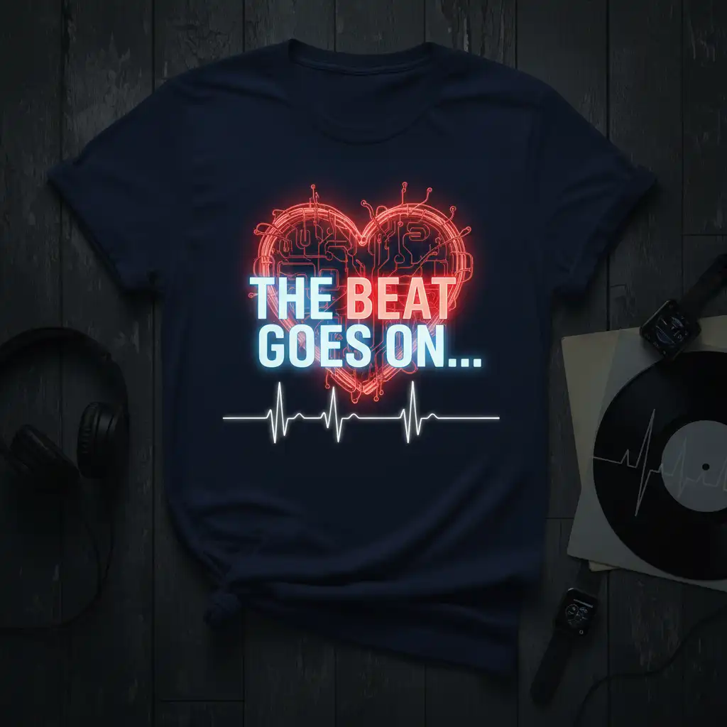 The Beat Goes On…This captivating t-shirt design embodies the enduring spirit of music and life itself. It features a unique graphic that merges the intricate beauty of electronic circuitry with the universal symbol of a heartbeat. The vibrant neon-style text, “THE BEAT GOES ON…”, is perfectly complemented by a stylized, glowing red heart, creating a visually stunning piece. This tee is an ideal choice for anyone who finds joy in music, appreciates technological artistry, or simply wants to wear a statement about life’s continuous rhythm.