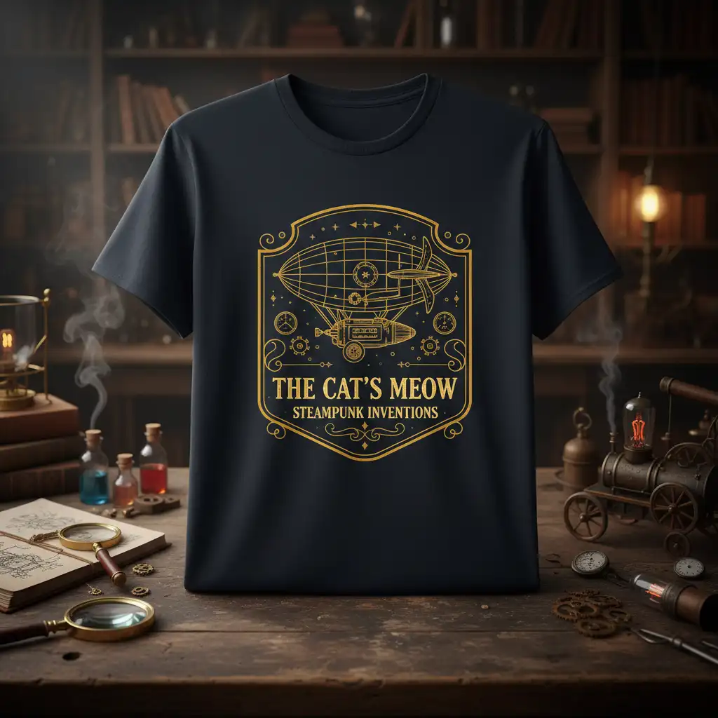 The phrase “The Cat’s Meow” adds a playful touch, suggesting that this invention is the absolute best or most remarkable. It perfectly complements the “Steampunk Inventions” tagline, creating a cohesive and memorable theme. This shirt is ideal for individuals who appreciate fine details and unique storytelling through fashion.