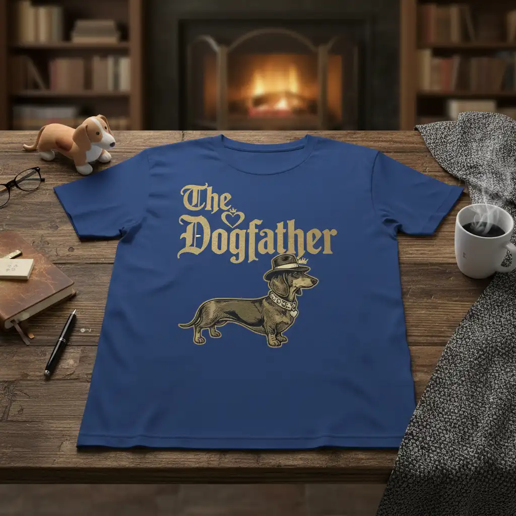 This exclusive design features the bold text “The Dogfather” rendered in a distinguished, old-English style font, immediately evoking a sense of classic authority. Below the text, a charming dachshund is depicted wearing a stylish fedora and a regal crown, complete with a pearl necklace, embodying the spirit of a distinguished leader. The combination of thematic text and the dapper dachshund creates a memorable and humorous graphic that resonates deeply with dog lovers everywhere. It’s a perfect blend of pop culture reference and canine adoration.