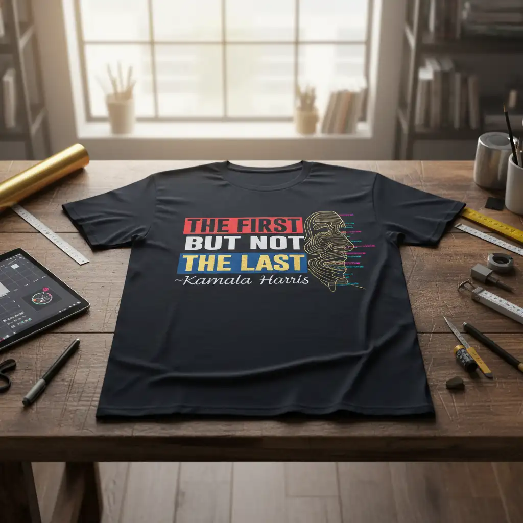 This striking t-shirt proudly displays the powerful quote “The First But Not The Last,” attributed to the trailblazing Kamala Harris. The design is thoughtfully crafted with vibrant colors for the text and an intricate line art portrait that honors her likeness. It serves as a constant reminder of her historic role and her ongoing impact on society.