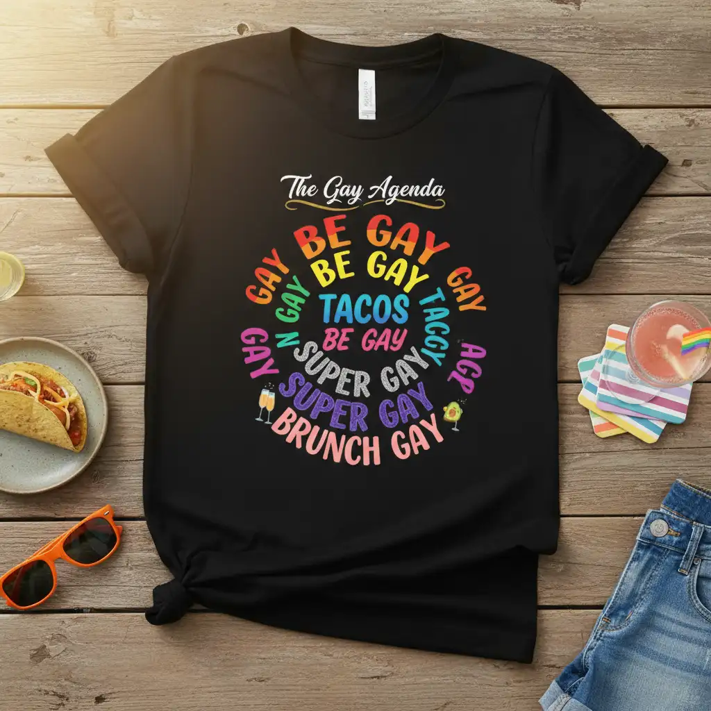 This unique design showcases “The Gay Agenda” in a playful yet powerful way, emphasizing the joy and community found in LGBTQ+ life. The circular arrangement of phrases like “BE GAY,” “TACOS,” “SUPER GAY,” and “BRUNCH GAY” creates a dynamic visual that’s both fun and meaningful. It’s a statement piece that sparks conversation and celebrates the freedom to be yourself.