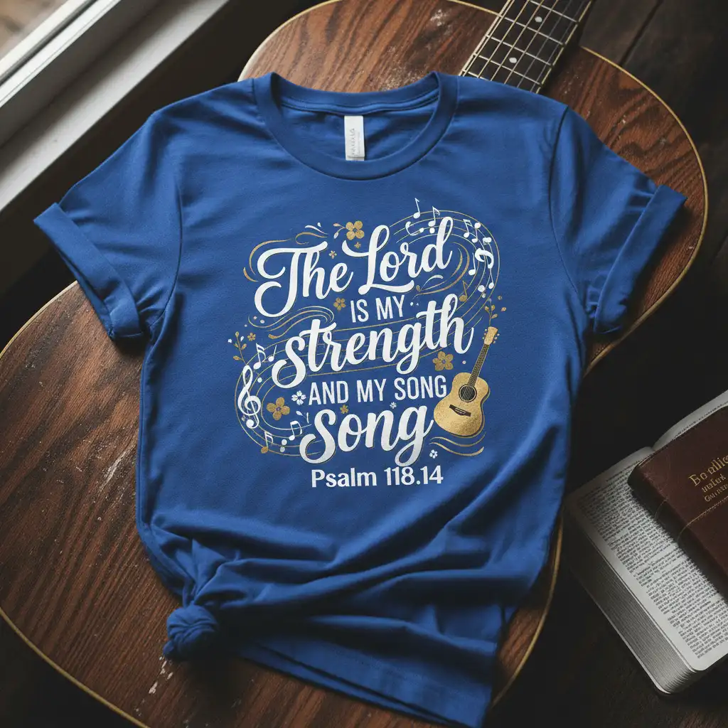 This t-shirt is designed for individuals who wish to openly share their faith and passion for music. It’s an excellent conversation starter, inviting others to reflect on the source of their strength and the role of music in their lives. The message “The Lord is my strength” speaks to unwavering reliance on divine power, while “AND MY SONG” highlights the joyful expression of that faith through worship and praise.