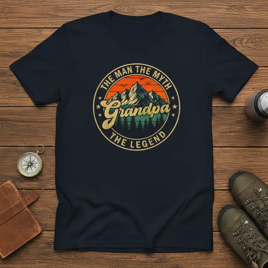 This t-shirt proudly displays “this design” in a striking, vintage-inspired circular graphic. The design features a majestic mountain range set against a vibrant sunset, with a serene forest landscape below. This imagery evokes a sense of adventure, wisdom, and timeless appeal, perfectly reflecting the character of a beloved grandfather. It’s a unique and thoughtful gift that speaks volumes about his importance.