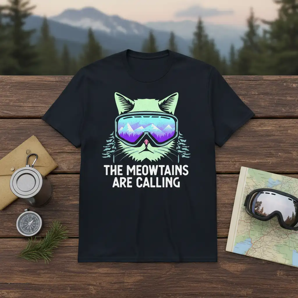 This vibrant t-shirt features a striking design that immediately catches the eye. The central graphic depicts a cool cat adorned with ski goggles, the lenses reflecting a breathtaking mountain panorama. This imagery perfectly embodies the playful pun, making it a must-have for anyone who hears the mountains calling their name. It’s a fantastic way to showcase your love for cats and your passion for winter sports or mountain exploration.