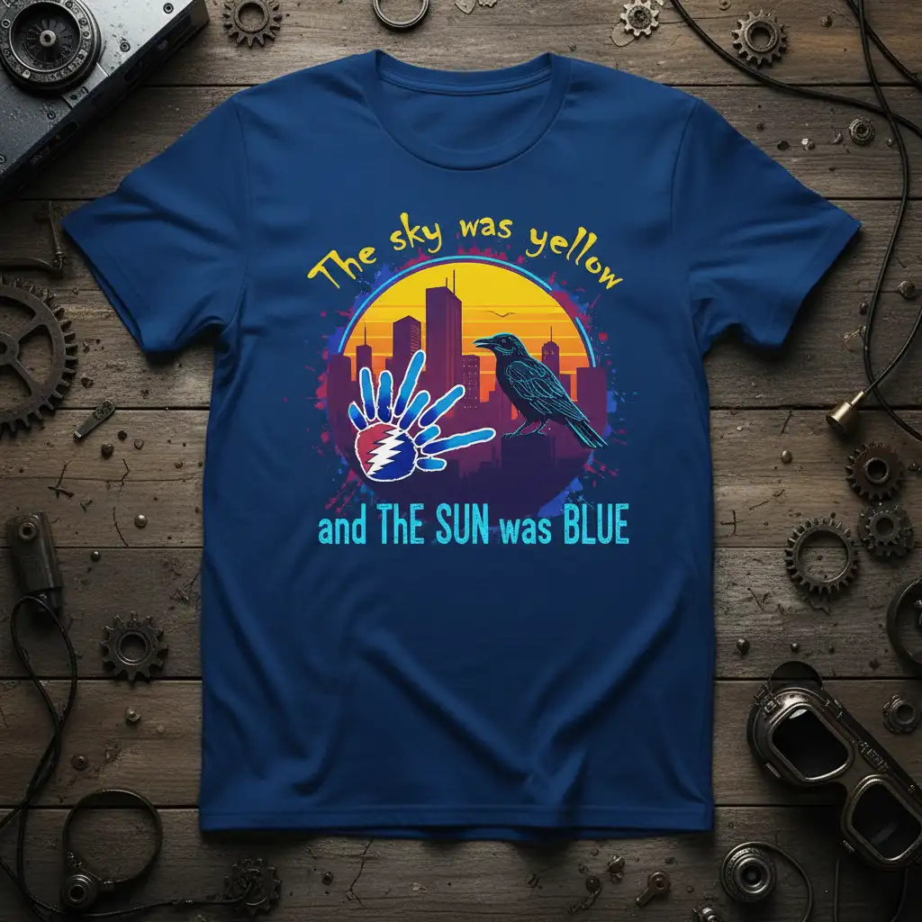 This t-shirt prominently features the unforgettable phrase “The sky was yellow and THE SUN was BLUE,” making it an ideal choice for music enthusiasts and art lovers alike. The design incorporates a stylized tie-dye hand symbol, a crow perched against a colorful cityscape, and a vivid sunset. It’s a visual representation of lyrics that have resonated with many, offering a unique way to express personal style and fandom.