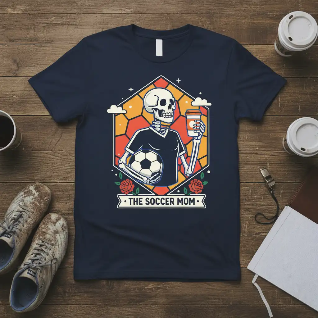 The intricate hexagonal design framing the skeleton adds a unique artistic flair, making it stand out from typical fan gear. Roses add a touch of classic femininity, while the surrounding stars and geometric patterns create a vibrant, eye-catching look. This tee is perfect for anyone who embraces the busy, rewarding life of a soccer mom.