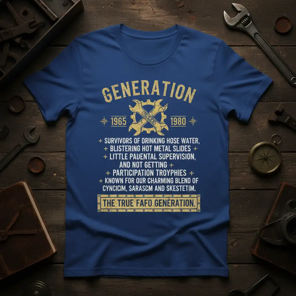 This generation, marked by the years 1965 to 1980, is humorously described as “Survivors of Drinking Hose Water” and experiencing “Little Pauental Supervision.” The design further highlights a lack of “Participation Trophies” and a “Charming Blend of Cyncicim, Sarascm and Skestetim,” all leading to the declaration “THE TRUE FAFO GENERATION.” This witty portrayal resonates deeply with those who lived through these formative years.