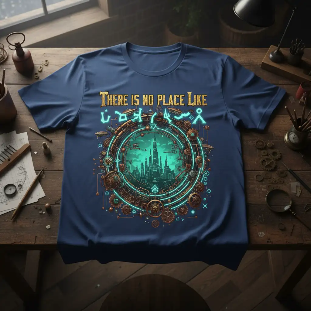 This captivating tee proudly displays the phrase “There Is No Place Like” above a mesmerizing steampunk portal. The portal itself is a marvel of design, featuring a complex arrangement of gears, pipes, and glowing abstract symbols that hint at advanced technology and arcane energies. Through the portal, a breathtaking fantasy cityscape unfolds, rendered in vibrant turquoise and emerald hues, reaching towards the sky with majestic towers and structures.