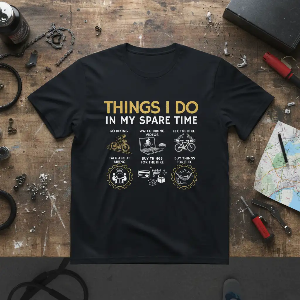 Our commitment is to provide apparel that not only looks great but feels amazing. The fabric is soft to the touch and built to last, maintaining its color and shape through countless washes. This ensures that your “Things I Do In My Spare Time” t-shirt remains a favorite in your wardrobe for years to come. It’s an ideal addition for any cyclist’s casual wear collection.