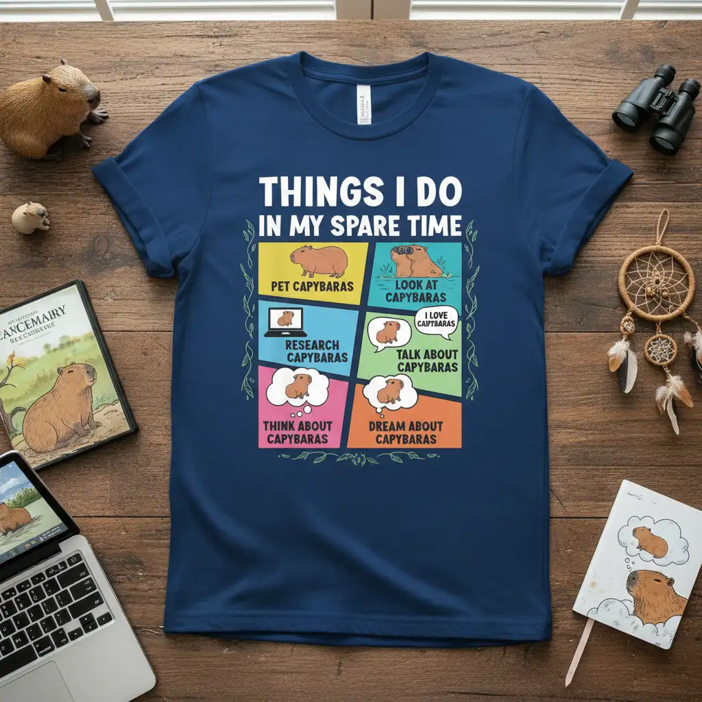 Things I Do In My Spare Time—this phrase perfectly encapsulates the dedicated passion of any true capybara aficionado. This t-shirt is more than just apparel; it’s a statement piece for those who find joy and fascination in every aspect of these gentle, semi-aquatic rodents. Whether you’re scrolling through endless capybara photos online or daydreaming about their calm demeanor, this design speaks to your soul. It’s crafted for comfort and style, making it the ideal way to showcase your unwavering adoration for these unique creatures. Get ready to connect with fellow enthusiasts and wear your capybara love proudly.