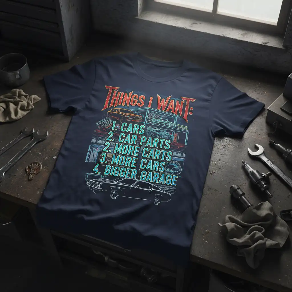 THINGS I WANT: 1. CARS 2. CAR PARTS 3. MORE CARTS 4. MORE CARS 5. BIGGER GARAGE. This t-shirt is more than just apparel; it’s a declaration of passion for all things automotive. It speaks directly to the heart of every car enthusiast, mechanic, and collector who dreams of the open road and a well-stocked garage. The design captures that relatable desire for more automotive joy in life. It’s a perfect way to express your dedication to the hobby and make a statement.