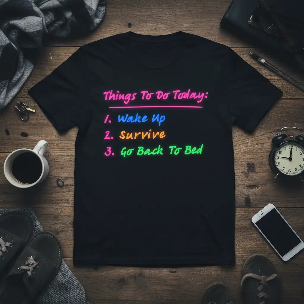 This t-shirt embraces a minimalist yet impactful design, featuring the quote “Things To Do Today: 1. Wake Up, 2. Survive, 3. Go Back To Bed” in vibrant, eye-catching neon colors. The typography is bold and clear, ensuring the humorous message is instantly understood. It’s an ideal choice for anyone who finds humor in the everyday grind and wants to wear their relatable daily routine with pride. This tee is a fantastic way to inject a dose of lightheartedness into your casual wear.