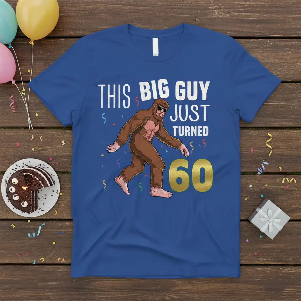 The “This Big Guy Just Turned 60” t-shirt is designed for maximum impact and celebration. It features the full quote in eye-catching typography, paired with a cool, sunglasses-wearing Bigfoot illustration. The prominent gold “60” signifies the significant milestone, making it instantly clear that this is a special birthday tee. This design is crafted to bring smiles and laughter, embodying the fun spirit of reaching this fantastic age.