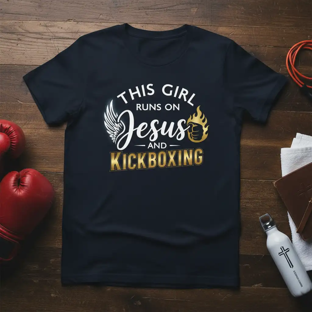 THIS GIRL RUNS ON Jesus AND KICKBOXING, a powerful statement for every woman who finds her strength in both her faith and her passion for martial arts. This design embodies the spirit of dedication, resilience, and unwavering belief that fuels every kick and every prayer. It’s more than just apparel; it’s a declaration of identity for those who train hard and believe fiercely. Whether you’re stepping into the ring or finding peace in your spiritual practice, this t-shirt serves as a constant reminder of the dual forces that empower you. It celebrates the unique journey of women who are both devout and dynamic, proving that strength comes in many forms.