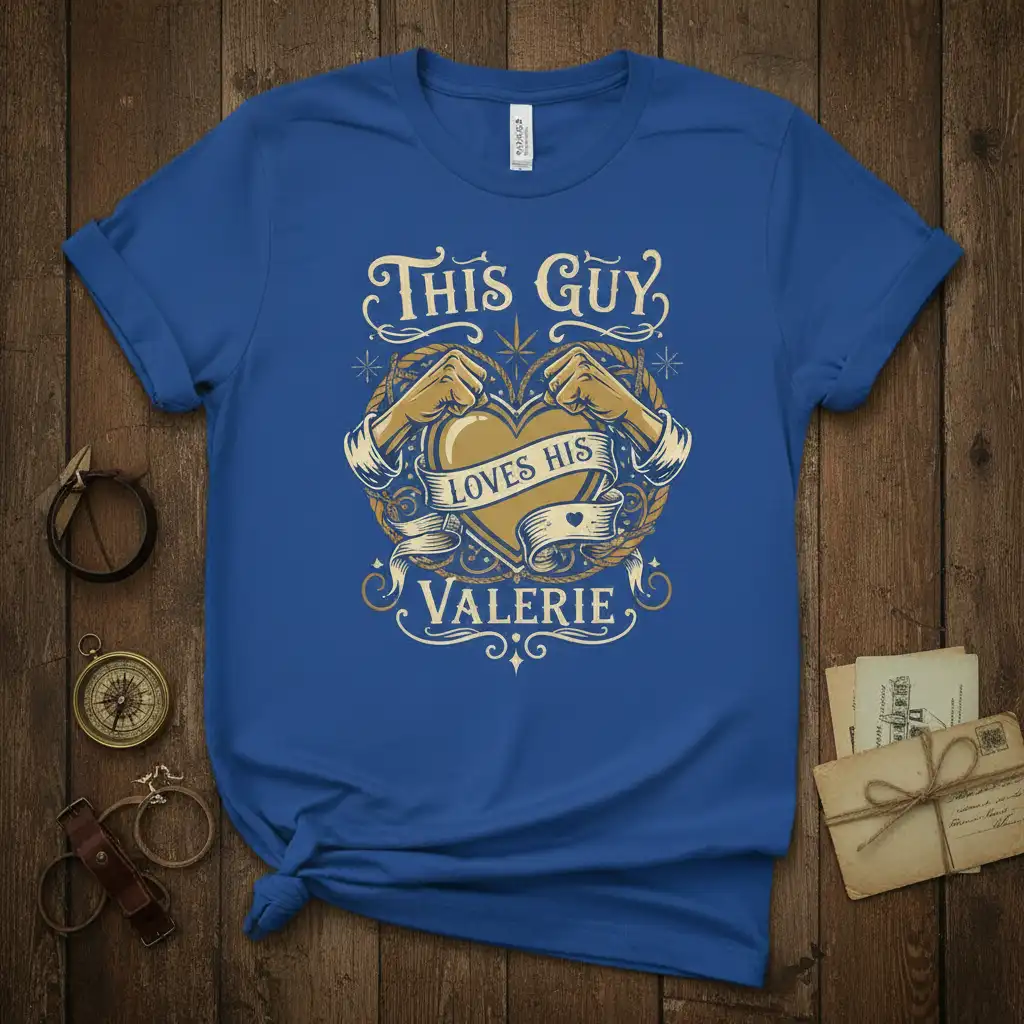 This t-shirt is more than just apparel; it’s a symbol of a special bond and a testament to enduring love. It’s an ideal way for him to express his feelings and for you to show him how much he is cherished. Make your next gift count with this unique and romantic design that celebrates the love between “this guy” and his Valerie. Order this special tee today and give a gift that truly captures the essence of your relationship.