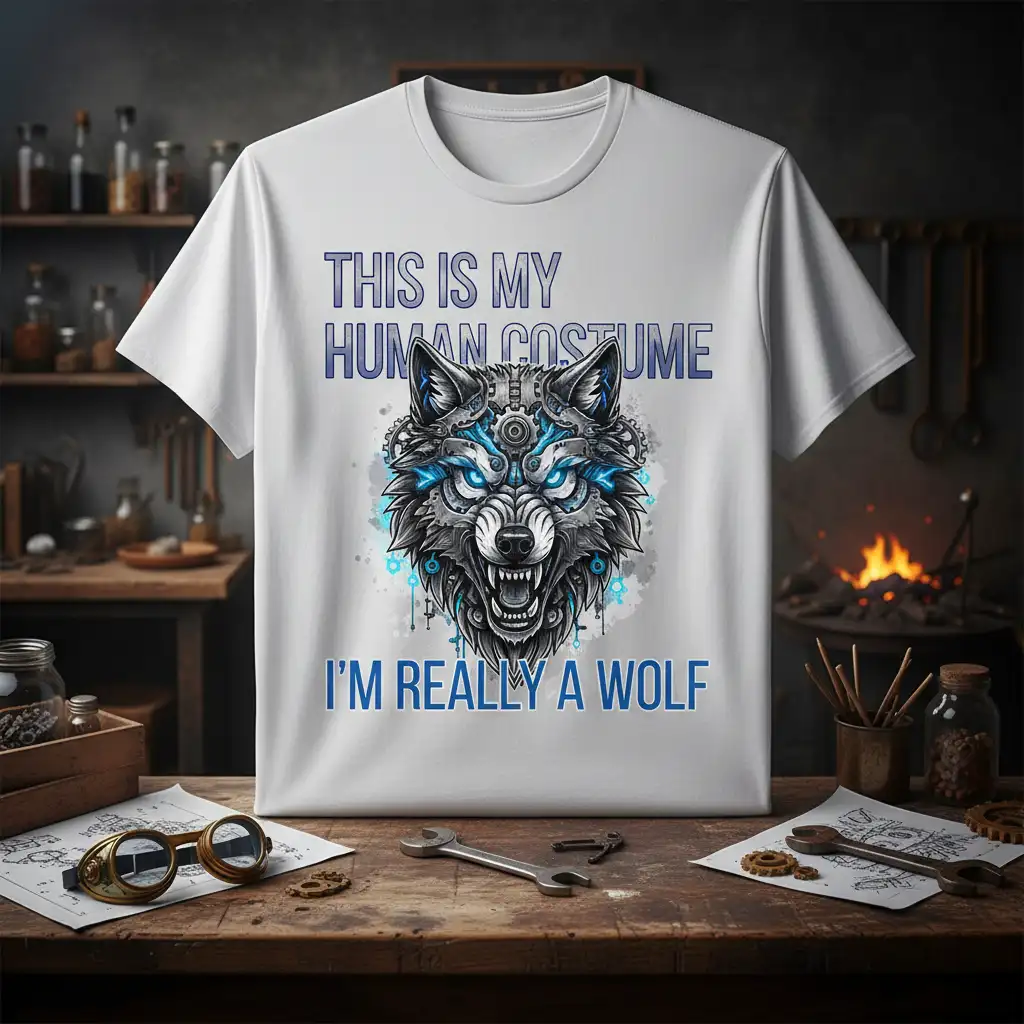 THIS IS MY HUMAN COSTUME I’M REALLY A WOLF, making a powerful statement for those who feel a primal connection to the wild. This unique t-shirt design captures the essence of transformation and the untamed spirit that resides within. It’s more than just apparel; it’s an declaration of identity for the free-spirited and the dreamers. Perfect for casual wear or as a standout piece for themed events, this shirt is designed to resonate with your inner wolf. Let the world know your true form with this striking and imaginative graphic.