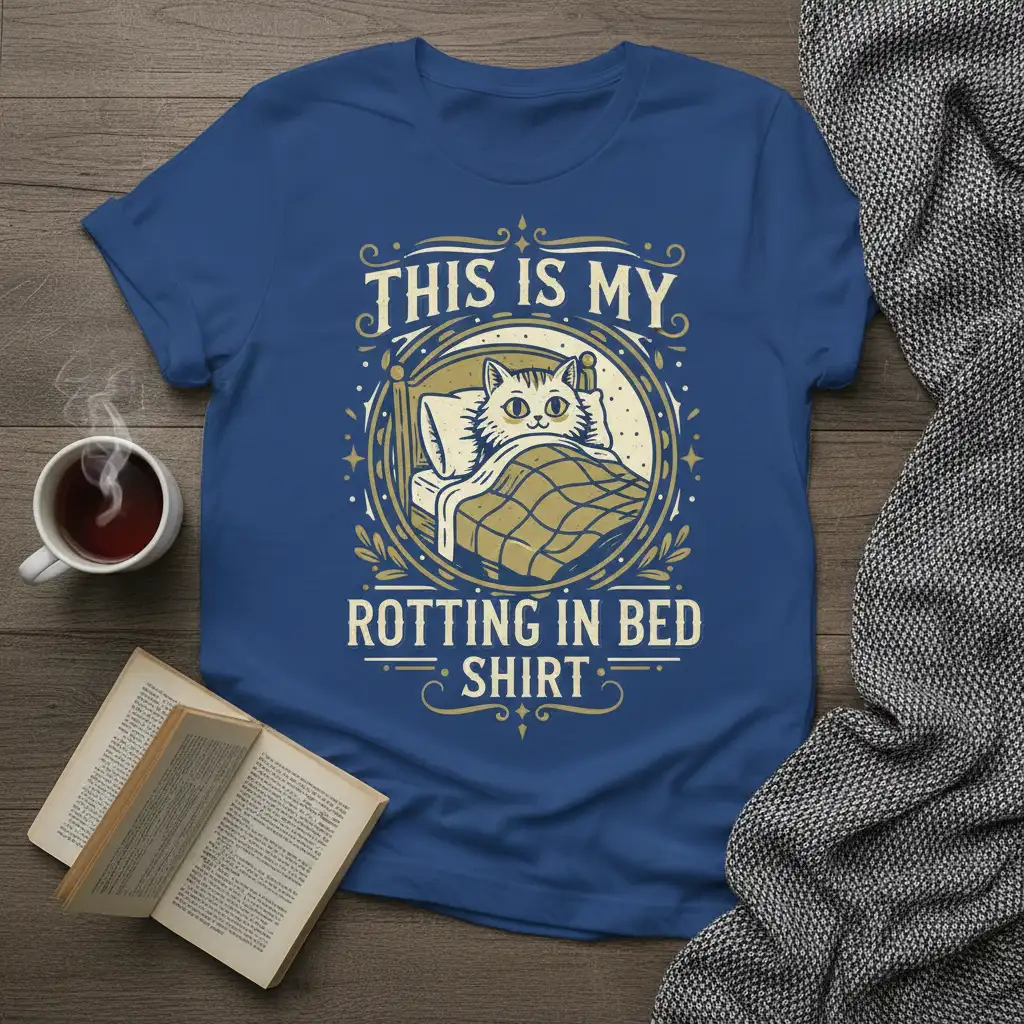 This unique t-shirt features a delightful graphic of a cat tucked snugly into bed, complete with a whimsical frame and decorative elements. The phrase “This Is My Rotting In Bed Shirt” is presented in a charming, vintage-inspired font that adds to its nostalgic appeal. It’s designed to resonate with anyone who loves their pets and their personal downtime equally. This shirt embodies a relaxed attitude and a love for all things cozy and comfortable.