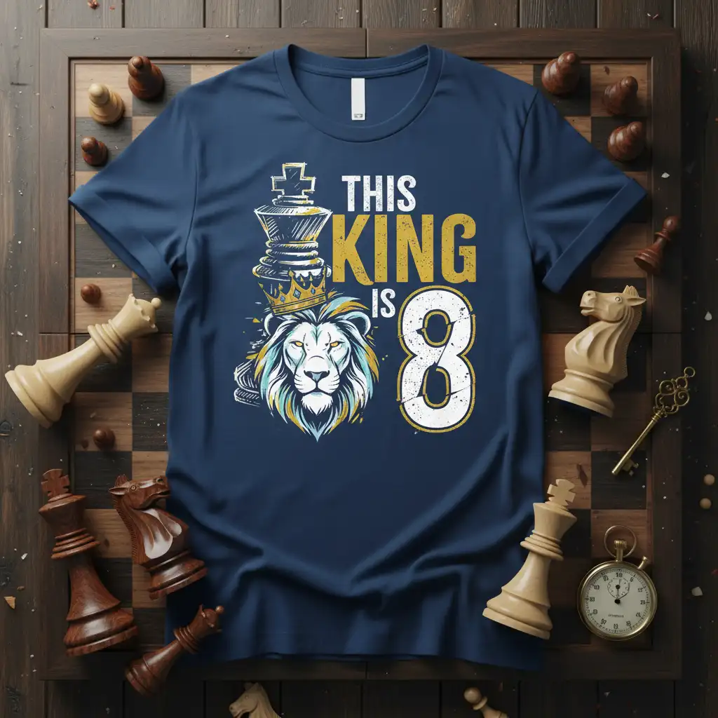 The imagery on this shirt is designed to inspire. Featuring a powerful lion, symbolizing courage and leadership, alongside an iconic chess king piece, it represents the strategic mind of a young player. The prominent number ‘8’ clearly marks the special occasion, ensuring everyone knows it’s their royal birthday celebration.