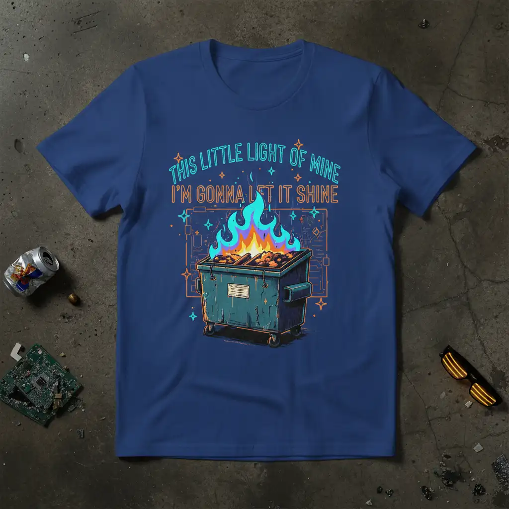 The phrase “This Little Light of Mine” is famously associated with a gospel song about letting one’s inner light shine for all to see. This design brilliantly juxtaposes that hopeful message with the universally recognized symbol of a dumpster fire, creating a powerful and humorous commentary on modern life. It’s a nod to the chaotic realities we often face, presented in a way that is both relatable and empowering. The vibrant flames and detailed dumpster graphic add a striking visual element, ensuring the message is delivered with impact and style.
