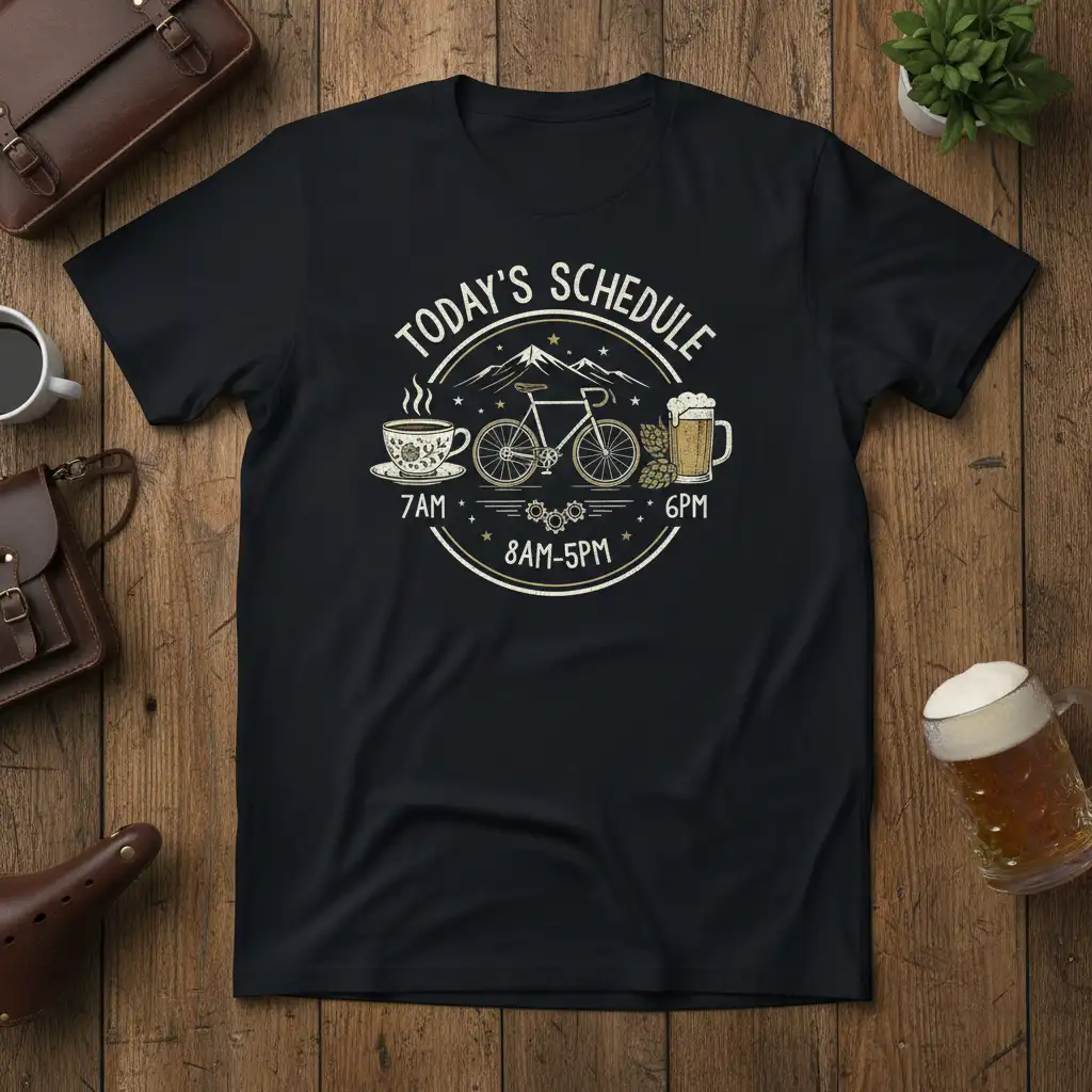 This TODAY’S SCHEDULE 7AM 6PM 8AM-5PM design captures the essence of a well-spent day, starting with a revitalizing cup of coffee at 7 AM, followed by a productive 8 AM to 5 PM focused on cycling adventures. The day is perfectly capped off at 6 PM with a refreshing beer, embodying the spirit of enjoyment and accomplishment. It’s a visual representation of a life well-lived, where passions are pursued and celebrated.