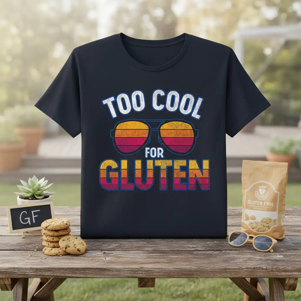 This Too Cool For Gluten design taps into the humor often associated with managing dietary restrictions. It’s a lighthearted way to acknowledge the challenges and triumphs of a gluten-free lifestyle. The retro sunglasses add a touch of coolness and personality, making it a fun piece to wear. It’s about embracing your choices and sharing a positive outlook, even when navigating food labels and dining out.