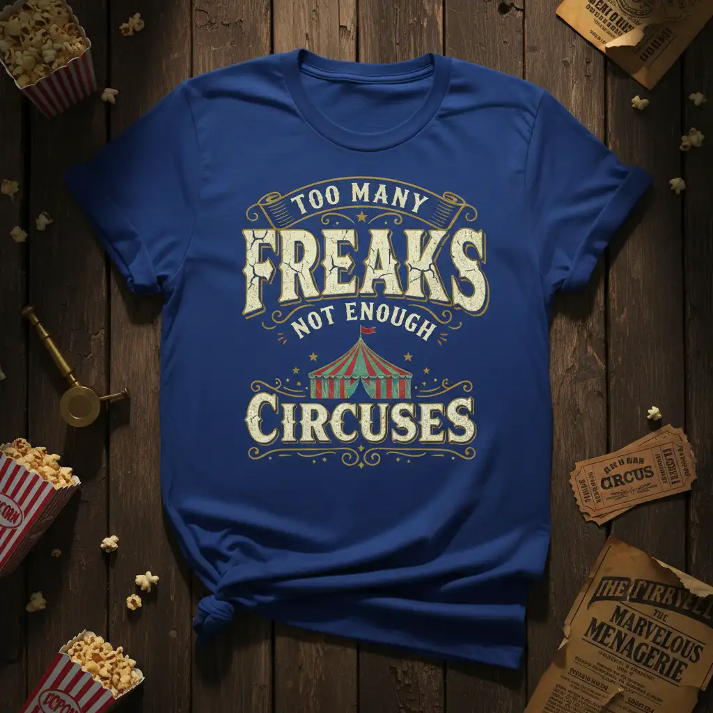 Pick from Black, Navy, Royal, Dark Heather, Red, and White to match your mood and wardrobe staples. Each colorway keeps the TOO MANY FREAKS NOT ENOUGH CIRCUSES design clear and photo-ready for everyday wear.