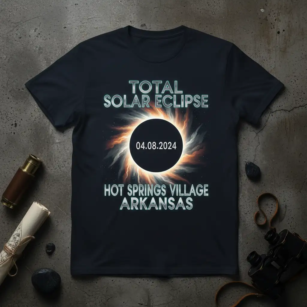 Don’t miss the chance to own this commemorative t-shirt celebrating the TOTAL SOLAR ECLIPSE 04.08.2024 in HOT SPRINGS VILLAGE ARKANSAS. It’s the perfect way to honor a remarkable event and showcase your passion for the wonders of the universe. Whether for yourself or as a memorable gift, this shirt is a fantastic way to keep the magic of the eclipse alive. Grab yours now and wear a piece of celestial history!