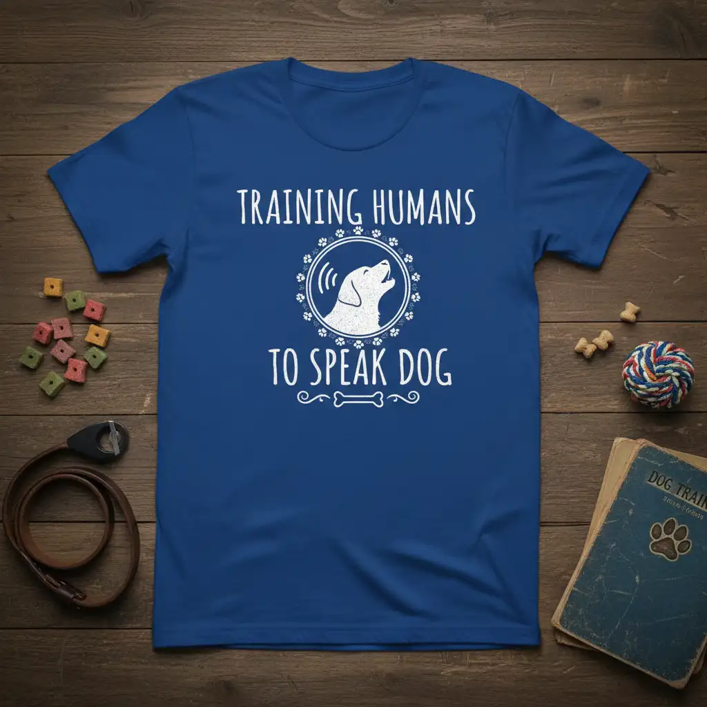 For those who master canine communication, consider this charming tee that humorously states “TRAINING HUMANS TO SPEAK DOG” or grab our similar hilarious I Speak Toddler funny tee.