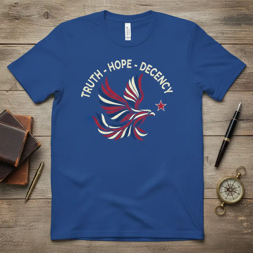 TRUTH – HOPE – DECENCY is more than just a slogan; it’s a declaration of fundamental principles that guide individuals and societies towards progress and integrity. This powerful t-shirt design captures the essence of these values, featuring a majestic eagle rendered in a patriotic palette of red, white, and blue. It serves as a wearable emblem for those who champion honesty, optimism, and ethical conduct in their daily lives and advocate for a better future. The design is crafted to resonate with a sense of civic duty and personal conviction.
