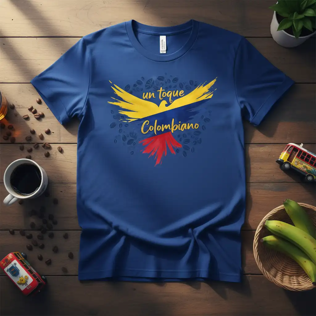 This t-shirt proudly displays the phrase “un toque Colombiano,” a declaration of belonging and appreciation for one’s roots. The graphic artfully blends the iconic yellow, blue, and red of the Colombian flag into a striking bird motif, symbolizing freedom and national spirit. It’s a design that speaks volumes without saying too much, embodying the warmth and character of Colombian culture.