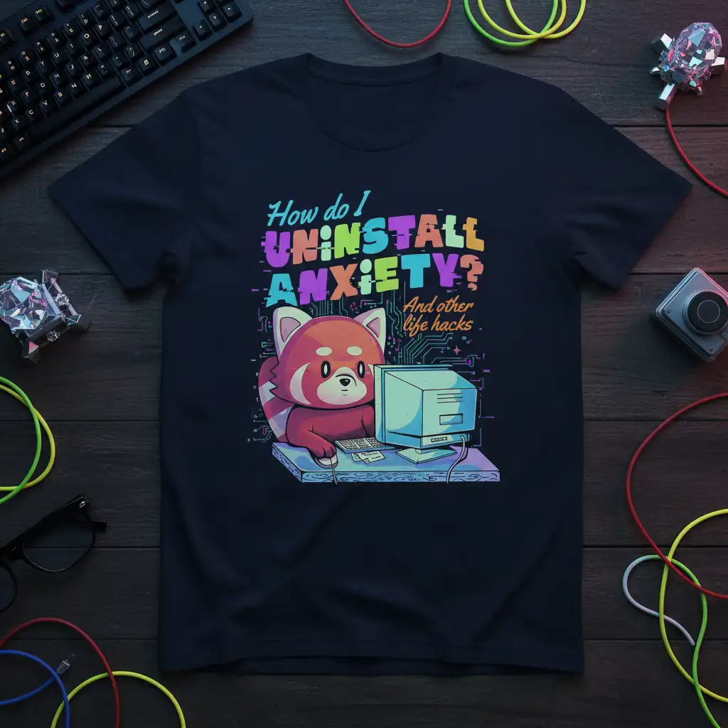 How do I UNINSTALL ANXIETY? And other life hacks tee is more than just apparel; it’s a conversation starter and a relatable statement for anyone navigating the complexities of modern life. This unique design features a charming red panda engrossed in a vintage computer, embodying the universal desire to find solutions to overwhelming feelings. The vibrant, pixelated text and circuit board graphics add a retro-tech flair, making it a perfect fit for tech enthusiasts, gamers, and anyone who appreciates a touch of humor in their mental health journey. It’s a comfortable and stylish way to express your inner thoughts and connect with others who understand. This shirt is designed to bring a smile and spark meaningful conversations.