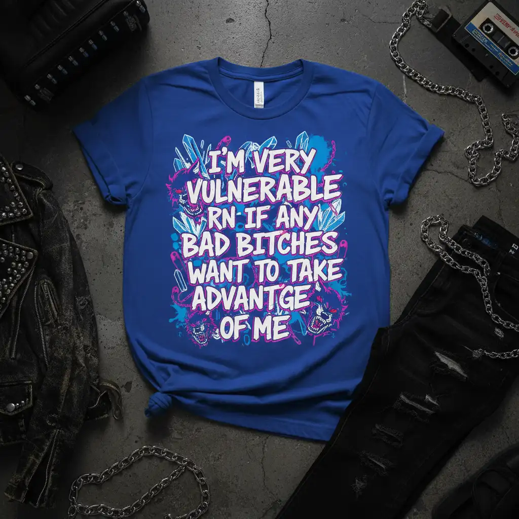 This graphic tee features the full, unadulterated quote “I’m Very Vulnerable RN If Any Bad Bitches Want to Take Advantage Of Me” emblazoned across the front. The design is brought to life with a vibrant color palette, including striking blues, sharp whites, and pops of neon pink and turquoise. Edgy graphics of stylized monsters and sharp, crystal-like elements surround the text, amplifying its rebellious and humorous vibe.